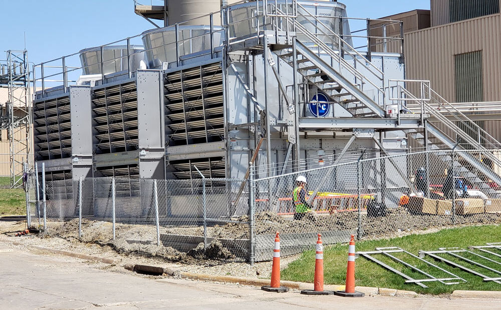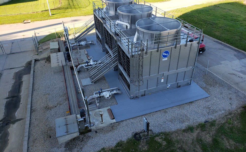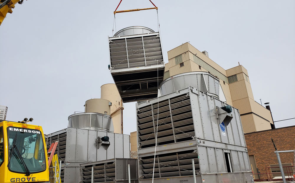 The work included removal of the original wood cooling towers and installation of new stainless steel units. In addition to setting the three new towers, work included piping and activation, as well as the addition of fiberglass grating.