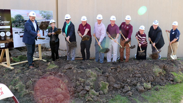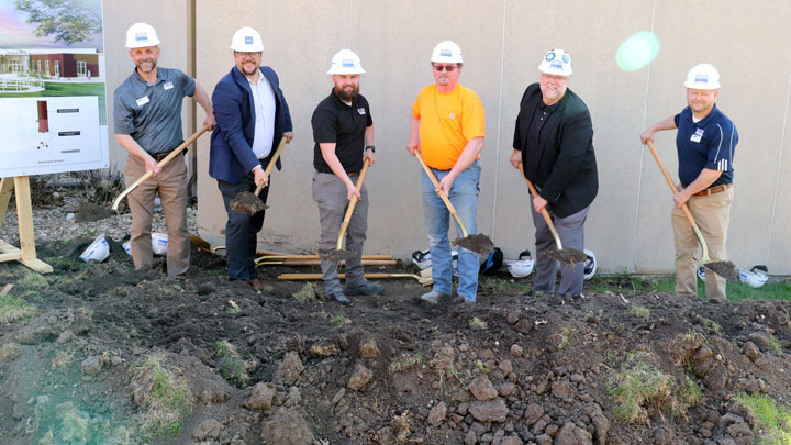 Construction and design team members join with Grundy Center Community School District Superintendent Robert Hughes, second from right, to help break ground on the district's K-12 improvement project, where Carl A. Nelson & Company (CANCO) is construction manager agent. From left are Chris Smith, CANCO vice president, operations (Burlington), and project executive; architect and project manager from ISG, Art Baumgartner; CANCO Project Engineer Steven Baridon and Project Superintendent Chad Sawyer; Hughes; and CANCO Project Manager Nick Liston. CANCO photo