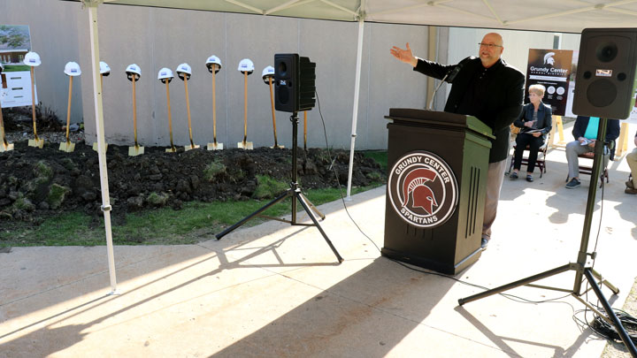 Grundy Center Community School District Superintendent Robert Hughes gestures toward the site of construction at Grundy Center Middle School/High School during remarks at a May 3, 2023, groundbreaking ceremony. The secondary school building will be the location of the most signifcant construction activity, while the elementary school also will get a facelift. CANCO photo